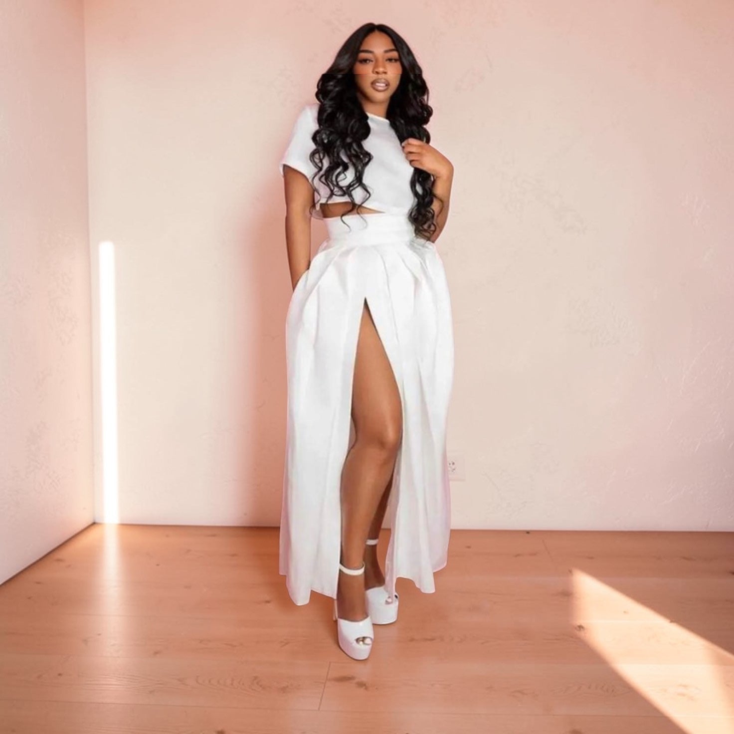 The structured crop top features a sleek, minimal design that highlights your waist, while the high-waisted skirt flows with grace—finished with a daring thigh-high slit that adds just the right amount of drama. It’s giving soft glam, but make it powerful.